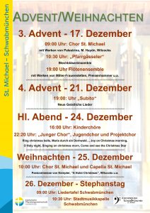 Genießen Sie an den Weihnachtstage die abwechslungsreichen musikalischen Angebote während unserer Messen in St. Michael. Seit vielen Wochen und mit viel Einsaatz proben die Musiker und Sänger, damit die Aufführungen gelingen!
