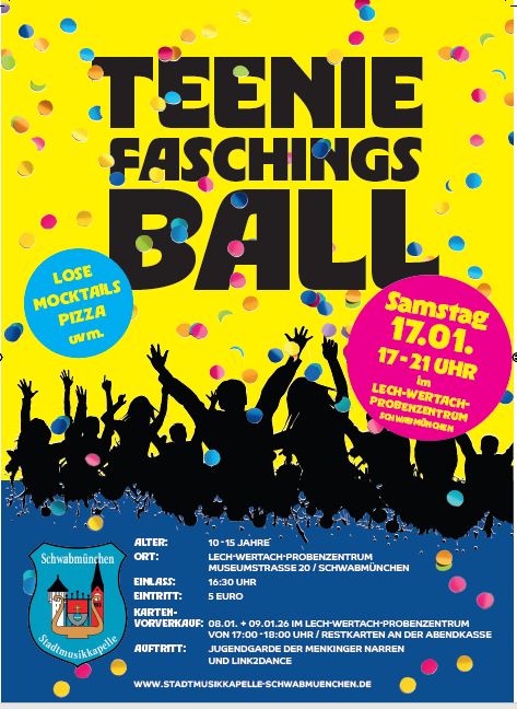 Kartenvorverkauf: 09.01.26 von 17-18 Uhr und 16.02.25 von 17-18 Uhr, Restkarten an der Abendkasse im Lech-Wertach-Probenzentrum Museumstraße 20a, SMÜ